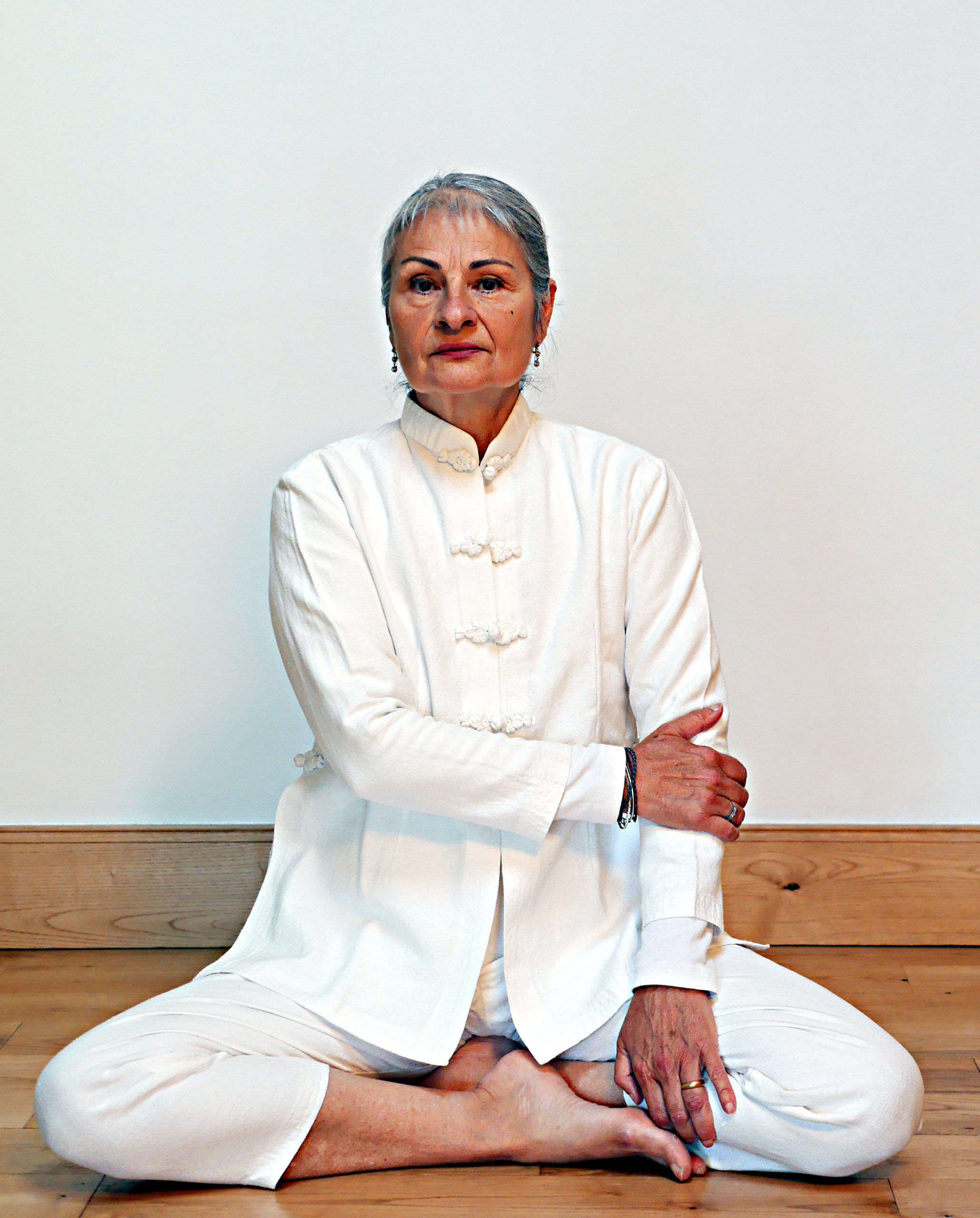 La main gauche est posée sur le genou gauche, la main droite tient le coude gauche l’avant bras à l’horizontal.