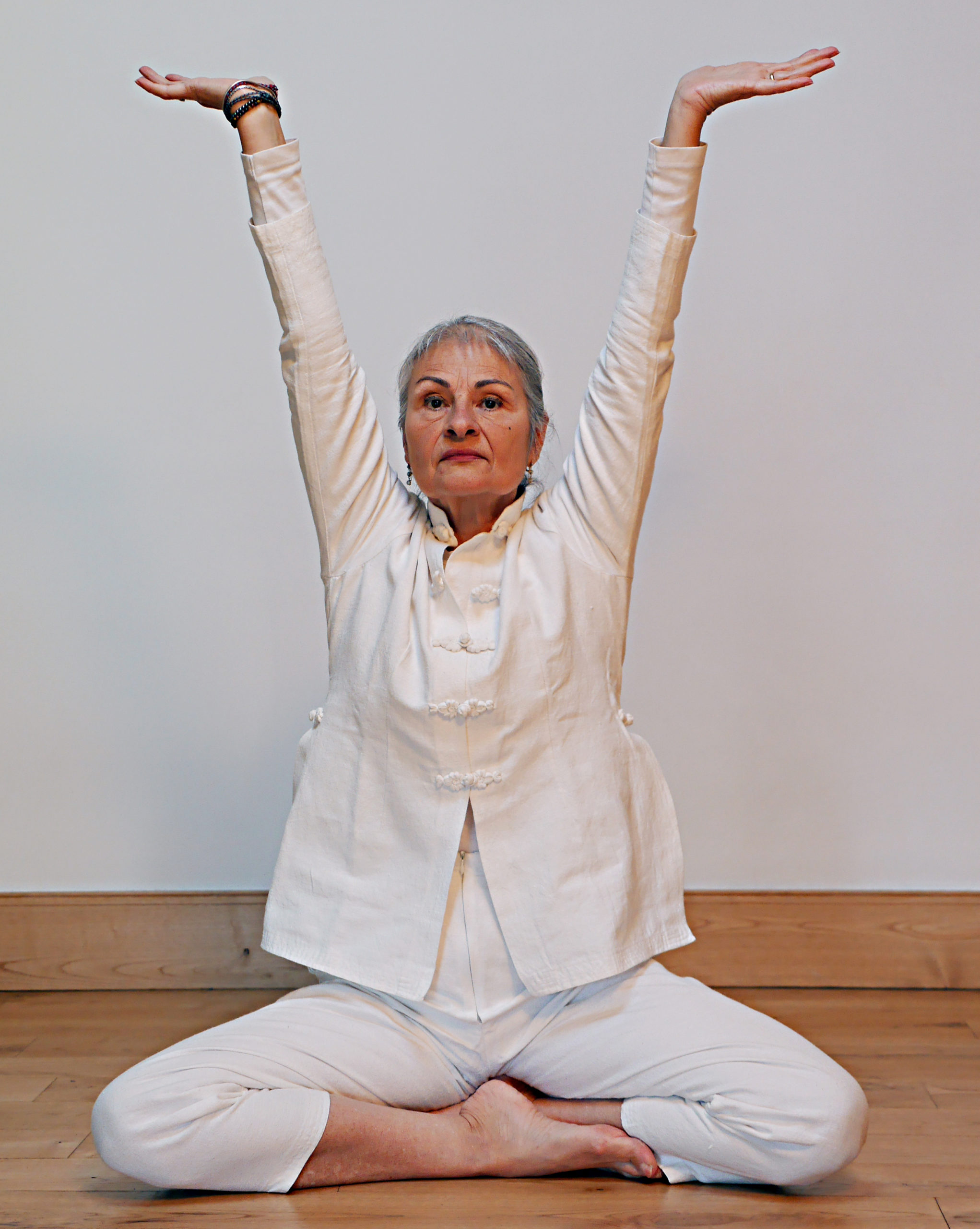 Tendre les bras et les mains énergiquement vers le ciel jusqu’à ce que le corps attiré vers le haut se soulève légèrement et que les fesses décollent du sol comme si on s’apprêtait à sauter en restant assis(e). Répéter 5 X le mouvement.